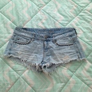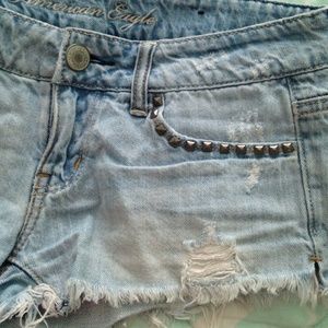 Size 2 American eagle distressed, light wash, denim shorts. Good condition and has super cute studs around the pockets. 😊