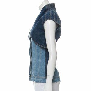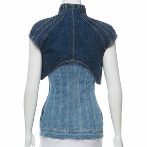 Design: Blue Alexander McQueen two-tone denim vest with V-neck, structured shoulders, overlay at bust and button closures at front.