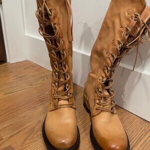 *SOLD* Step out in the Steward boot from A.S.98. This utilitarian-inspired lace-up boot is designed with a charm and tassel embellished back zipper and we love the leather wrapped midi sole for a little extra height. Color is Camel. EU36 (fits US 5.5-6). Smoke free, pet friendly home. NWT (no box). Normal distressing as shown, typically for AS98.