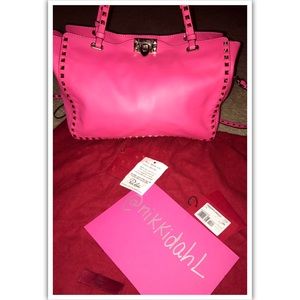 GUARANTEED 100% AUTHENTIC Valentino rock studded pink fuchsia calf leather tote cross bag. Platinum finish medal studs and hardware. Metal flip lock closure. Detachable strap. Protective feet. Purchased online at Rue Lala for $2400. I have carried maybe twice, in beautiful condition. Comes w original dust bag, extra stud and care instructions. Measurements- W: 13" H: 9" drop from double handle to bag 8 1/2. Beautiful one of a kind color!! No stains, discoloration or missing studs!!