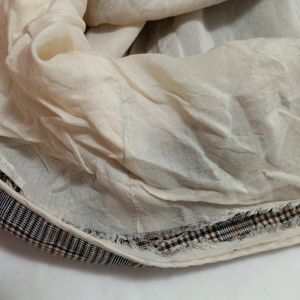 no size or material tags. presumed fabric blend, has the texture and feel of cotton with the strength and resilience of wool.