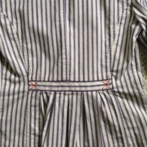 Unique cream colored blazer with navy stripes and subtle orange stitched accents. 3/4 sleeves with flare. Single button closure with two pockets in front. Back has a little flare too under slightly cinched waist--so cute!! Size 0, 24" long. Like new!