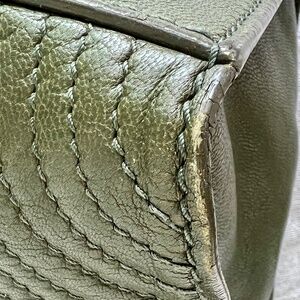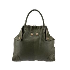 Crafted in rich, deep olive leather with sculptural gold-tone hardware, this large De Manta tote is a striking example of Alexander McQueen’s visionary design. With dual rolled handles, protective leather feet, and a wide structured silhouette, it’s both bold and functional.