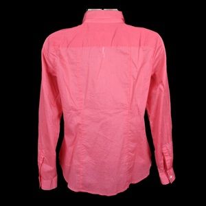 This women's Ann Taylor Loft semi-sheer blouse is size XS Petite and NWT! The 100% cotton fabric is semi-sheer and solid coral. The top features a button front, standard collar, 2 front chest pockets, and button cuffs. No tears, stains, or major were noted!