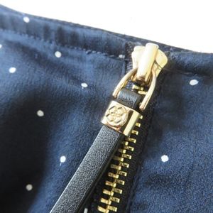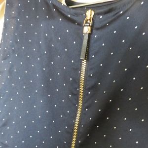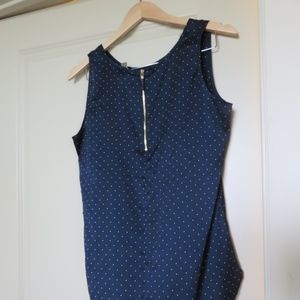 Ann Taylor Navy Polka Dot Tank top. Gold accent zipper on back. I often wore it both ways - it looked cute with the zipper in front as well. It is a longer tank that pairs well with leggings, boots, and a sweater.