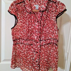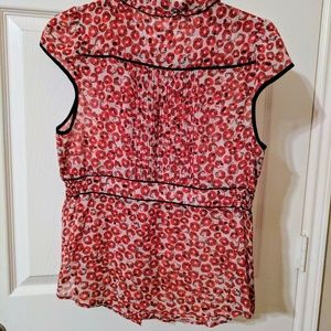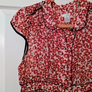 Floral, cap-sleeve top with black trim. Pintuck detail on front + back and ruffle finish down the center. This was one of my faves when it fit ❤️.