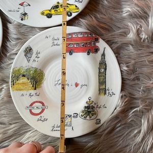 Anthropologie Linea Carta Salad Plates featuring I Love You from Paris, London & New York City. Plates are 8.5" across. Fantastic preloved condition. These are super fun and quirky plates that would be perfect salad or dessert plates. Set of 3 included.