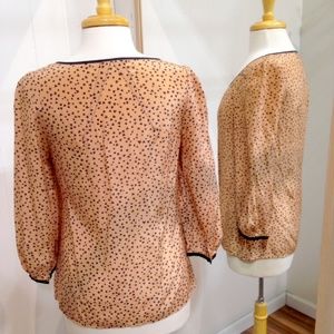As worn by Glee's Lea Michele! Odille silk blouse with an Alice in Wonderland vibe. Peachy blush button-up with black hearts, spades, clubs, and diamonds. Teeny tiny white spot on front left (see photo). Not noticeable when worn. Mannequin is size 6, so this fits more loosely/flowy than most Anthro pieces I've owned. A great day to night piece.