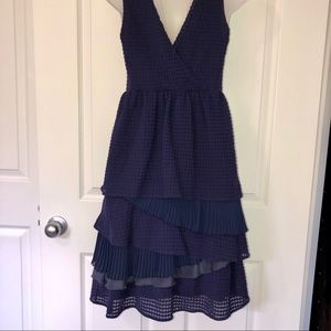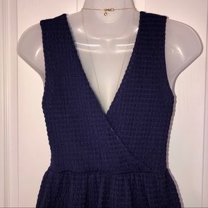 SOLD - Purple/ navy blue ππ mixed media sleeveless dress. Flattering V-neck/ crisscross neckline with waffle weave pattern and ruffles from the waist down accentuating a small waist/ hourglass figure. Gorgeous for work, a night out, or special events. Dress up with pearls and heels or dress down with a jean jacket and wedges! Cotton, jersey lining, silk, polyester. In great condition without flaws, well cared for and coming from a smoke and pet-free home, delivered laundered + ready to wear.