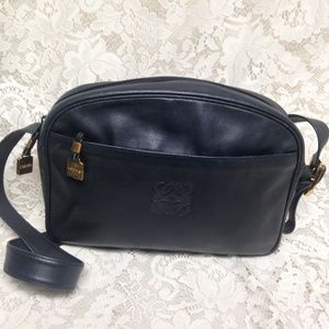 This is an elegant, genuine black leather purse and it measures 11 inches long, 8 inches wide and 3 inch thick and comes with a 40-inch shoulder strap. The inner lining has issues, scratches, peeling off, repairs surrounding zipper, soiling, etc but overall the exterior is in good condition with minimal wear as shown in photos. It is marked: Loewe, Madrid 1846, Made in Spain.