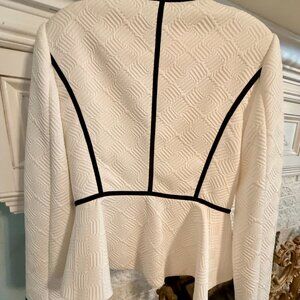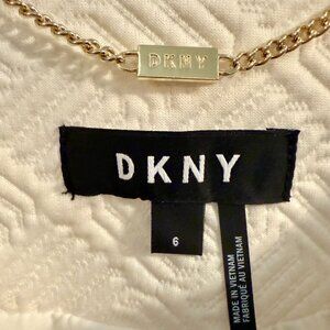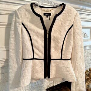Black & White Gold Zip DKNY Blazer. Size 6. Never Worn. Would look great over a black dress, skirt , black leather pants, or slacks. Very professional looking. Shoulder pads. Shipping included.
