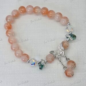 This elegant bracelet features a stunning butterfly charm in silver, complemented by peach and green beads. Perfect for adding a touch of sophistication to any outfit. (Stretch Bracelet)