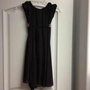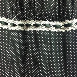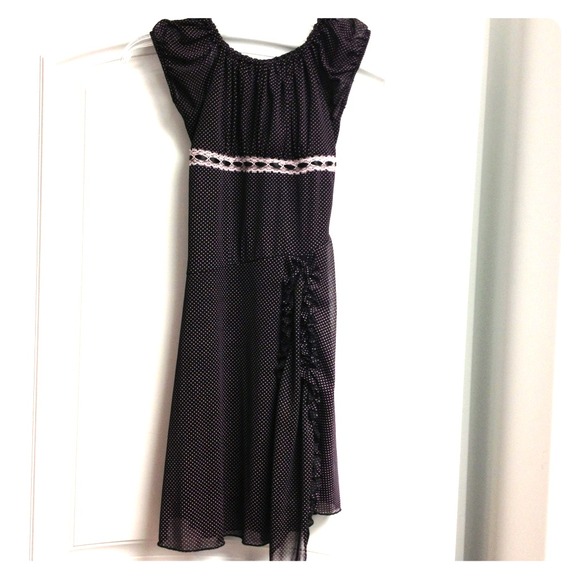 Like new dress. Color is hard to see. Dress is black with purple polka dots. Ties at waist, beautiful!! Size 10. Fully lined, 100% polyester.