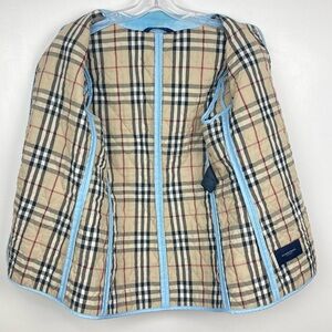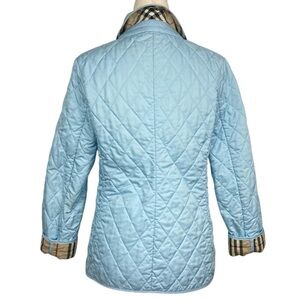Light blue Burberry quilted jacket with the classic Burberry check lining visible at the opening and cuffs.