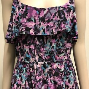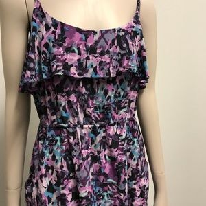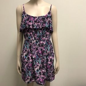SOLD - Super cute water color floral design mini dress. 100% Silk with adjusting straps and ruffle front. Has cinched waist and pockets.