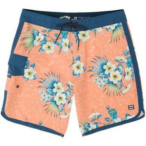 This pair of Billabong Recycler 73 Lineup Pro board shorts is size 36 and NWT! The 90% recycled polyester and 10% spandex fabric is orange with blue trim and hibiscus flower print.
