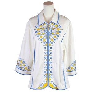 The ivory zip-front jacket features striking metallic gold, blue, and white embroidery in an ornate medallion motif with floral accents and cutout detailing at the neckline—true to the brand’s “wearable art” ethos. 3/4 bell sleeves and piped seams complete the sculptural silhouette. The coordinating sunshine yellow short-sleeve tee includes a small embroidered blue daisy and the Bob Mackie signature on the sleeve and zipper for a playful finishing touch.