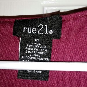 Beautiful for holiday season. Has a silky detachable tie that ties in a bow on front, back, or size. Lace detailing, deep red/burgundy/maroon color. Short. Size M but should also fit S.