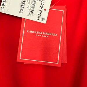 This striking (2025 sold out) red Carolina Herrera dress features a flattering ruched design at the waist and long fitted sleeves. The crew neck adds a touch of sophistication, making it an ideal choice for any occasion. Tailored to hug the body's contours, it creates a sleek and elegant silhouette. Never worn! Intact with tags! attached size chart.