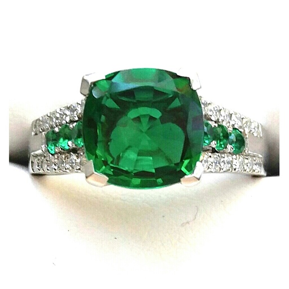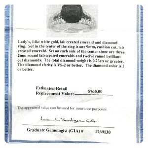 14 kt white gold, diamond and lab created emerald ring. 9mm cushion cut emerald, surrounded by 3 on each side 2mm emeralds and a total of 12 round brilliant cut diamonds.GIA certified