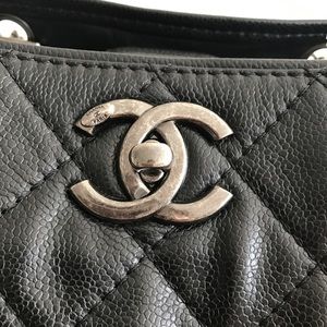 Chanel black quilted caviar leather be caviar medium shopping tote from 2014 fall collection. Guaranteed authentic. Ruthenium hardware. Interior of bag is completely done in leather. There are three components including a zipped portion. Bag is in pre owned and gently used condition. Bag comes with a dust bag. Authenticity card is missing but code in 20013115.
