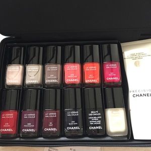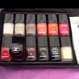 Gorgeous Chanel Nailpolish set includes nail polishes: 157 Ballerina, 559 Frenzy, 505 Particuliére, 549 distraction, 617 Holiday, 541 Tentation, 475 Dragon, 599 Provocation, 18 vamp, 219 black satin, Beauté des ongles extreme shine, Beauté des ongles protective base coat and Chanel nourishing and rejuvenating hand cream. Comes inside gorgeous Chanel box.