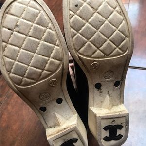 Selling a pair of uses Chanel rain boots in good condition. There is wear - scuffs can be seen throughout the boots and some marks on the white areas of the heel and on the flowers.