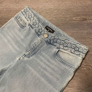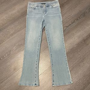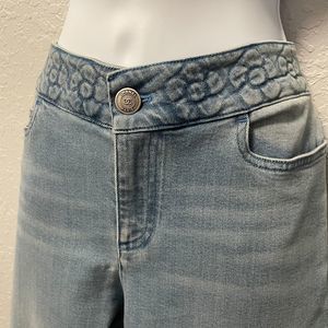 Beautiful Chanel jeans. From Karl Lagerfeld SS16 Collection. Light wash denim jeans with flowers along the waistline, interlocking CC waist button and zip pull. On the back pocket is embroidered “Chanel”. Mid rise. Little flare right at the bottoms. Chanel FR 40 is like US 8, see all measurements in photos!