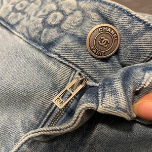 SOLD Chanel Flower Straight Leg Jeans Light Wash Embroidered Logo Zip 5 Pocket