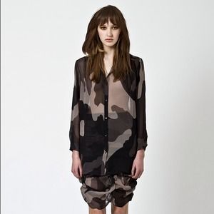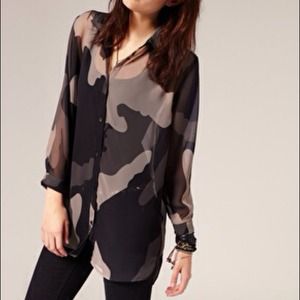 Sheer button-up blouse with a camouflage print. Loose, boyfriend-style fit. Wear it over a simple black bra or a tank for a sexy nighttime look! You can also tie the ends of the shirt for a smaller fit. In great condition, only worn twice.