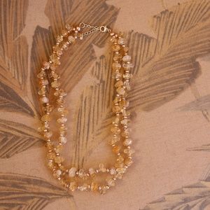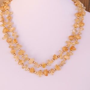 Genuine Citrine double strand necklace with mixed shaped stones and briolettes. Gold tone beads intermixed and gold over sterling clasp.