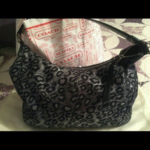 Coach black & silver Ocelot handbag plus matching wristlet. 100% authentic! Lightly used, but no signs of wear and tear, no rips, no stains, no scuffs. Also includes the crossbody strap and dust bag. I purchased it brand new with tags and have not used it much. Thanks for looking, loves! Just shoot me an offer!