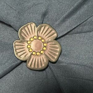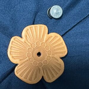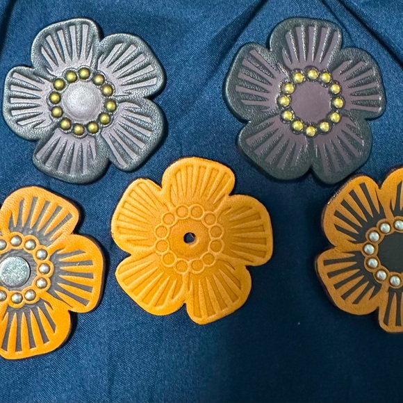 Selling a bundle of Coach tea roses, please see all photos. One black/oxblood and one saddle tea rose comes with Coach rivets. The other black/oxblood and the two other tea roses had the rivets damaged when I took them off the bag they were on. Photos show holes on the backside where the rivet was removed. On one of them, I punched a hole through the front to insert an off brand rivet; this could be done with the other two to attach them to a bag. The front side of these tea roses are not damaged. Please reach out if you have any questions and refer to the photos.