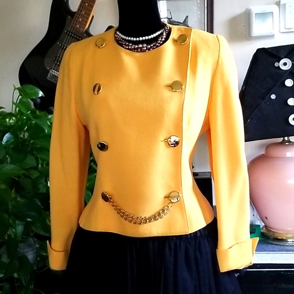 Dark intense yellow coat with gold buttons made of Lightweight wool. Cinched waist that flatter the body figure. In excellent condition. The exact color captured in the 1st and 2nd photos.