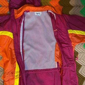 Vintage Colorblock (magenta/orange/yellow) Reebok Windbreaker Jacket w/drawstring and hideable hood. Breathable mesh inside. Roomy size Small.