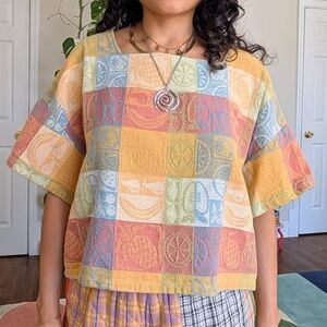 Repurposed patchwork boxy upcycled top from vintage tablecloth