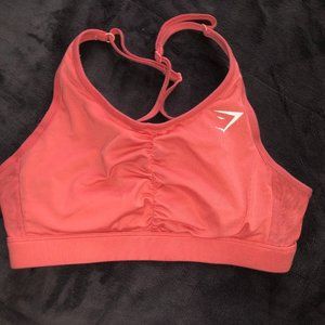Coral Gymshark Ease Sports Bra (2018). Flattering ruching in the front, crossback straps. Size S. Comfortable, supportive, cute! Perfect for working out, jogging, yoga. In good condition!