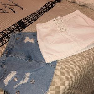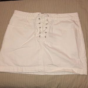 Denim color- medium wash denim. Mini lightweight style. Two pockets in front, two in back. Grommet open design in front with fray detailing throughout. Forever 21. Never worn by me, reposhing. Size 29.