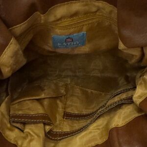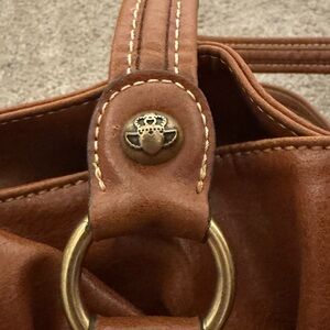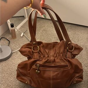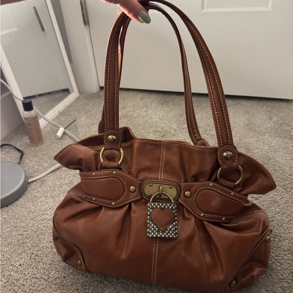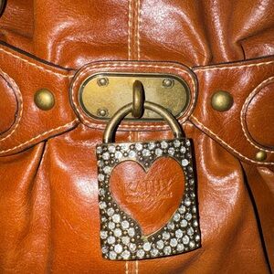 Soft cognac brown leather with gold-tone hardware. Double shoulder straps for easy carry. Decorative heart padlock charm adds feminine detail. Structured silhouette with gentle pleats. Stylish everyday accessory.
