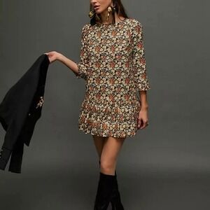 Free People Smooth Talker dress in mustard yellow floral print with a mock neck and dramatic open V-back cutout, easy pull-on swing silhouette with a flouncy hem, perfect for going out, date night, festival, and brunch. Condition: Excellent, Size: Small. Retail: $128+