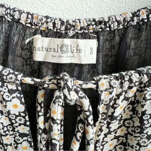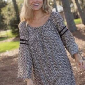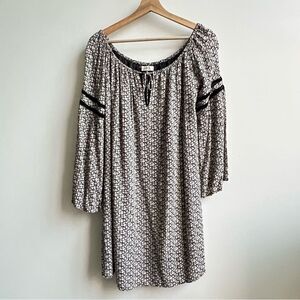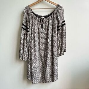Natural Life Black White Ditsy Floral Boho Peasant Bell Sleeve Flowy Mini Dress