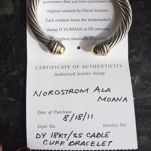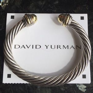 Authentic David Yurman 7mm cable bracelet. Sterling Silver and 14-karat yellow gold in excellent condition. This pre-owed bracelet comes with a certificate of authenticity and proof of Nordstrom department store receipt. This piece is so gorgeous a true classic wardrobe staple.