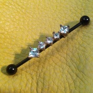 Black bar with black end stopper screw on balls. Five diamonds, in diamond shape. Brand new, never worn. Fits like piercing in fourth picture, just didn't want to put on the item I'm selling for hygiene reasons. Beautiful piece of jewelry✨