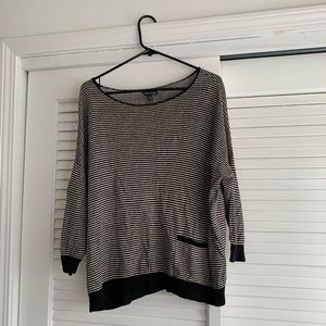 Organic linen knit top with boxy fit that drapes away from body, very loose upper arm and fitted at the wrist and closed up pocket.