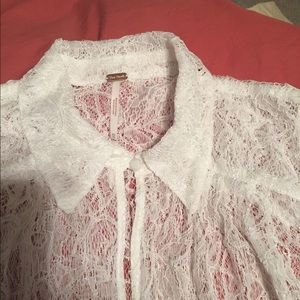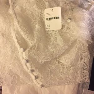 Brand new XS LACE SHIRT from Free People! Button and tie sleeves and button at neck for a more dressy look! Flawless and absolutely authentic! 100% perfect condition! The color is between the catalogue pic and actual pic. Gorgeous, soft and sexy white.