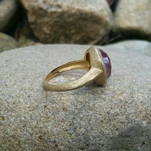 This natural ruby ring is to die for! It is stamped 925, but has been covered in burnished gold with gorgeous textured detailing all the way around the entire ring and band. The ruby is quite large and weighs approximately 9 carats. Despite its size, it's very low key and classy. The ruby is cut with a checkerboard top which lends itself to the organic design. Very good vintage condition. Would look stunning with your Kendra Scott jewelry!