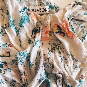 Brand is Billabong- front features a ruffle detailing with buttons (second photo). Background color is off white/cream with teal/turquoise/peach/yellow pattern. Cinches at waist for flattering feature and also has pockets!! Excellent condition, like new.