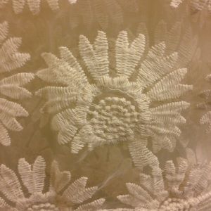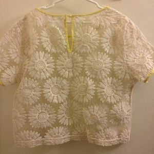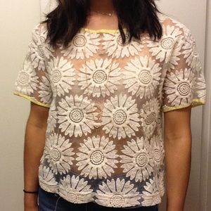 Very unique shirt. The flower pattern is sewed on to clear material. The shirt is perfect, the only downfall would be the stitching of one of the flowers on the backside of the shirt. It's not really noticeable though. Size is large, but fits all sizes (I'm usually a small). Cheaper on Ⓜ️ercari‼️