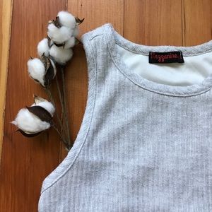 Sporty racerback, ribbed fabric. Styled with a pair of sneakers. Liner hits just above the knee.