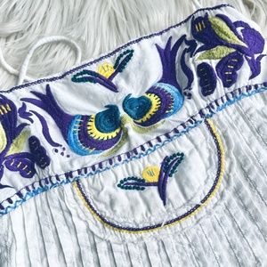 Embroidered mini dress. Loose fitting silhouette. Adjustable spaghetti straps. Embroidered detail on the upper part. Flattering and comfortable fit. Such a beautiful rare find from FP! As seen on Joey King.
